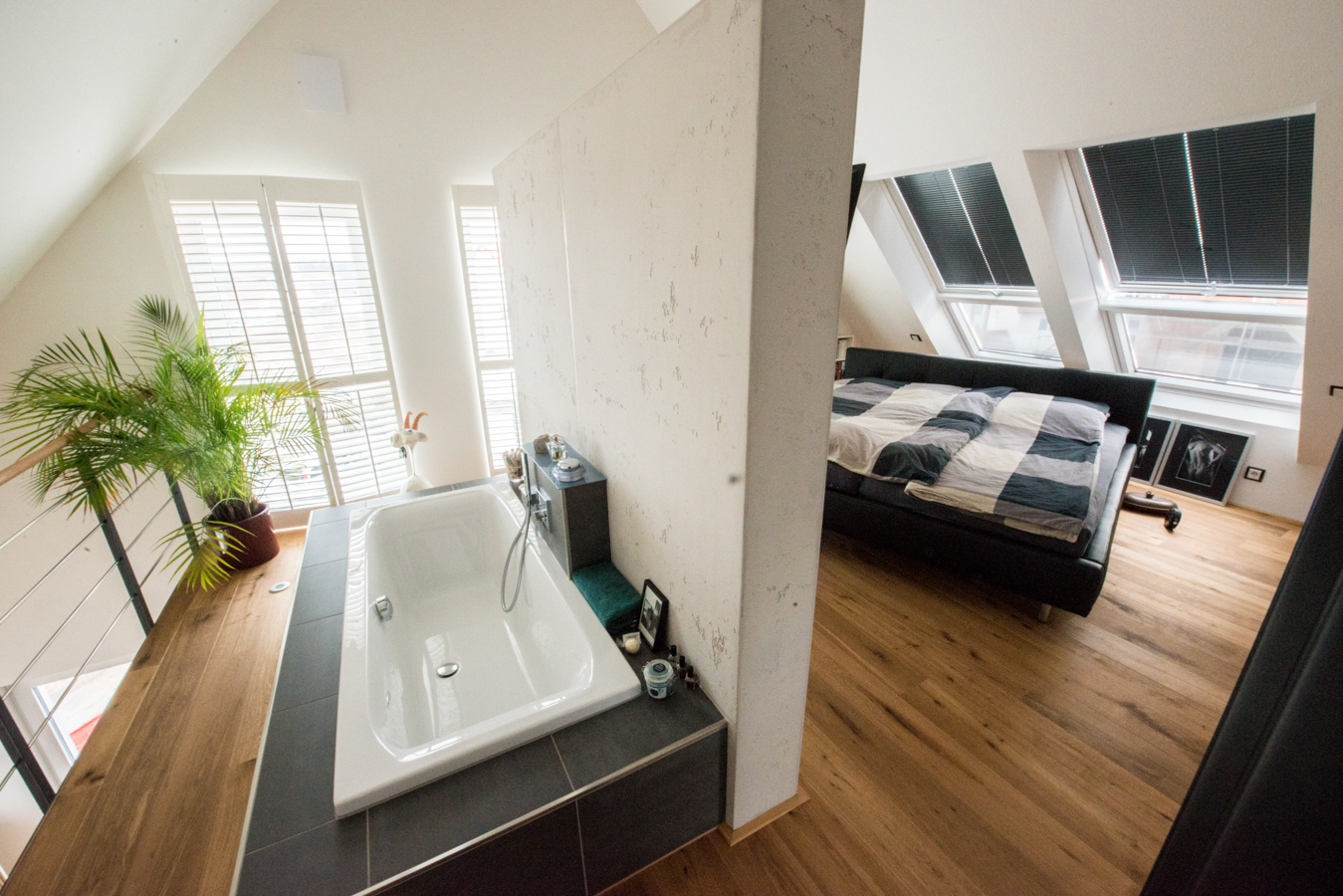 Das Schlafzimmer mit angrenzender Badewanne ist ein echter Hingucker. Der maßgefertigte Wannenträger ermöglicht eine passgenaue Flieseneinrahmung.
